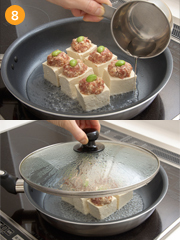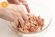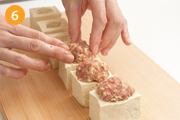 ボウルにくり抜いた豆腐と(4)、ひき肉、調味料Aを入れて混ぜ合わせる。