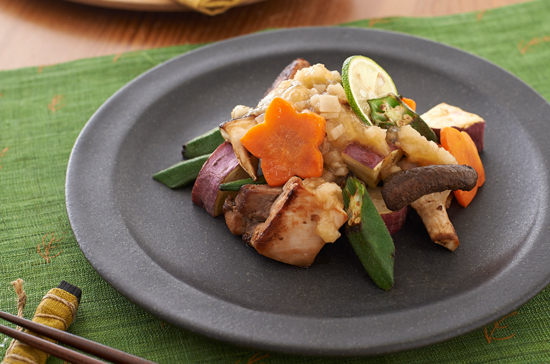 れんこんとすだちのソースで、鶏肉と野菜の美味しさが引き立つ、一皿で十分満足できるレシピ!色彩豊かでおもてなしにもオススメです。