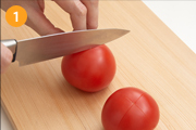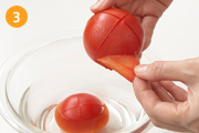 トマトのヘタを取り、反対側に浅く十文字に切り込みを入れる。