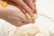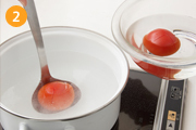 鍋に湯を沸かし、トマトをおたまに乗せてさっとくぐらせて、冷水にあげる。