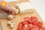 湯むきしたトマトと豆腐を1cm角(さいの目切り)に、ミートボールは4等分にする。
