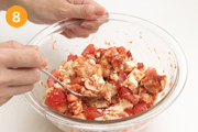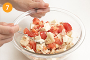 ボウルに(6)、ツナ、焼き麩を入れて、ざっくりと混ぜる。
