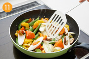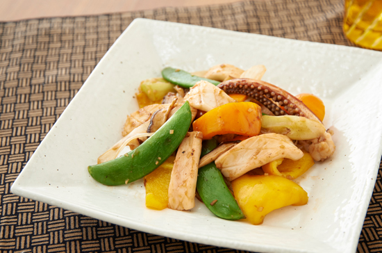 歯ごたえのあるイカやスナップえんどうを良く噛んで、ゆっくり食べることで満足感を得ましょう♪スナップえんどうは絹さやに変えても美味しく頂けます。