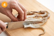 イカはまず、胴に一方の手の指を入れ、もう片方の手でエンペラをつかんで、わたを抜く。