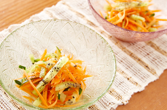 しゃきしゃきの生のにんじんに、キウイをプラスした、見た目にもさわやかなさっぱりサラダです。切って混ぜるだけ!簡単サラダで食物繊維とビタミンを上手に摂りましょう☆