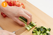 きゅうりとトマトをサイコロ状に切る(さいの目切り)。