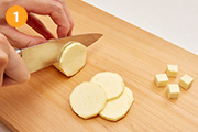 さつまいもは皮をむき、サイコロ状に4個カット(トッピング用(1人分2個))、残りは薄切りにする。