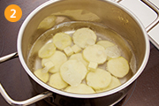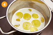 生クリーム、牛乳、砂糖、薄切りのさつまいもを鍋に入れて、混ぜながら弱火で1~2分間加熱する。