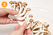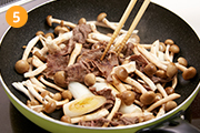 肉をさっと炒めたら、白ねぎ・しめじの順に加えてさらに炒める。