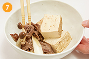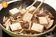 ある程度火が通ったら、焼き豆腐、出汁、砂糖、醤油を入れ煮込む。