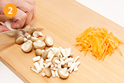 にんじんは細切りに、しめじは食べやすい大きさ(1cm程度)に切る。