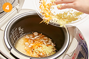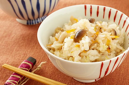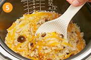 炊飯器に米とだし汁、調味料、具材すべて入れて炊飯する。