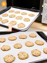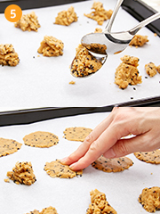 オーブンの皿にクッキングシートを引き、生地を小さじ1杯程度落としたら指で押して2mmほどの厚さに成形する。(12個程度できる)