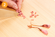 塩抜きした桜の花のうち2輪は刻み、1輪は半分に切る。
