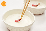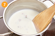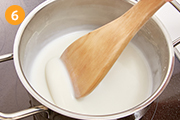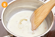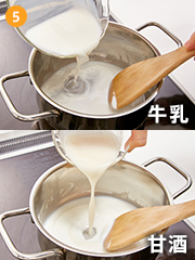 (4)に牛乳を少しずつ加えた後、甘酒も加えて混ぜ合わせる。
