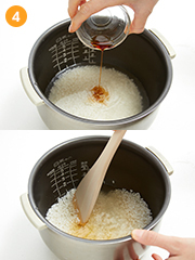 炊飯器に米とだし汁、調味料を入れて混ぜる。