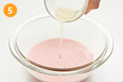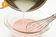 ボウルに牛乳を少しずつ加えながら、泡だて器で静かに混ぜる。