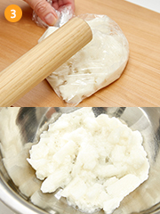 山芋を袋に入れて形が少し残るくらいまで、すりこぎなどでたたく。