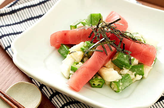 シャキふわ山芋とネバネバおくら、まぐろの相性ぴったり!超簡単な一品☆わさびを使って醤油を控えめに。