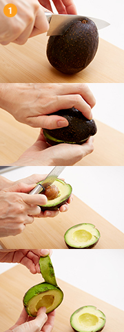 アボカドの周囲に包丁を入れ、上下にねじってふたつに分ける。