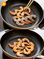 フライパンにオリーブ油を薄くひいて海老を焼き、塩を振る。