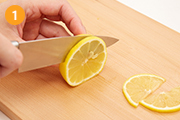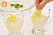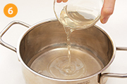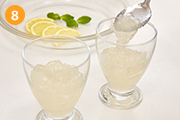 (4)が少し冷めたら、レモン汁と炭酸水、(5)を加える。