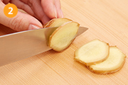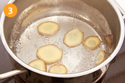 鍋に水50ccと甘味料、薄く切ったしょうがを入れて火にかける。