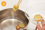 鍋が沸騰したら弱火にし、さらに10分から15分程度火にかけたらしょうがを取り出す。