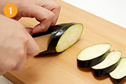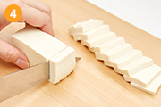 豆腐を半分に切り(または三等分)し、5mm幅の薄切りにする。