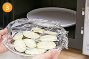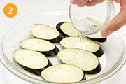 耐熱皿になすを並べたら水をふりかけ、ふんわりとラップをする。