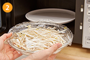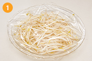 もやしは水で洗い、耐熱皿に広げてラップをする。