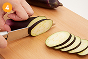 なすは厚さ5mmほどの斜めの輪切りにする。