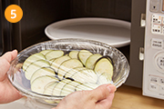 なすを耐熱皿にのせラップをしたら、500Wのレンジで約3分間加熱する。