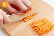 にんじんは皮をむき、長さ5cm程度の千切りにする。