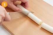 長ねぎの繊維にそって中央まで切り込みを入れ、中央の芯を取り出す。