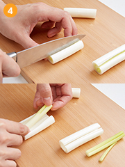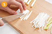 (4)の白い部分を重ねて千切りに、芯も千切りにする。