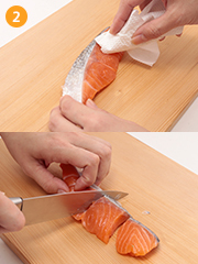 鮭の水分を拭き取り、一口大に切る。