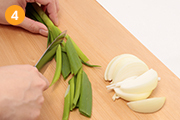 玉ねぎはくし切り、青ねぎは斜め切りにする。