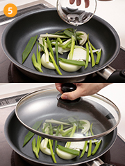 玉ねぎ・青ねぎをフライパンに入れたら大さじ1杯の水を加えて蓋をし、中~弱火で蒸し焼きにする。