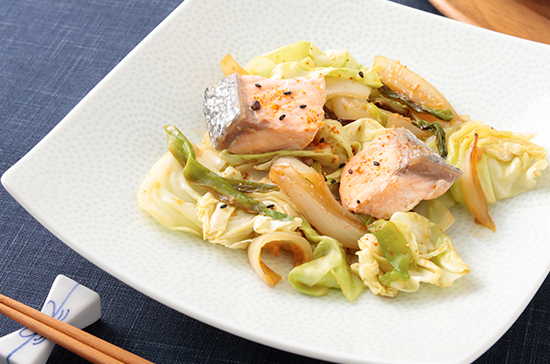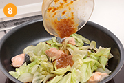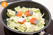 玉ねぎ・青ねぎが少ししんなりしたら、キャベツ・鮭を加えてキャベツがしんなりするまでさらに蒸し焼きにする。