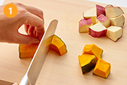 洗ったかぼちゃ・さつまいもを2cm程度の角切りにする(皮つきのまま)。