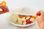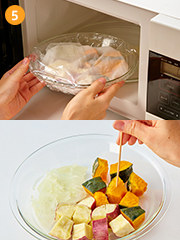 (4)にラップをかけたら、600Wの電子レンジで5分くらい加熱する。