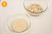 米を0.5合ずつに分け、1つに雑穀ミックスを入れ、水に浸たして30分置く。