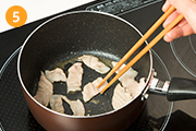 フライパンにごま油を熱し、(1)の豚肉を加えたら色が変わるまで炒める。