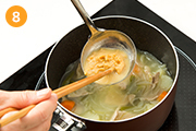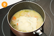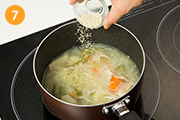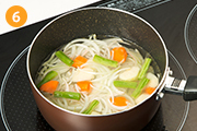 (5)に玉ねぎ、じゃがいも、にんじん、いんげん、水を加えて煮る。