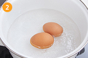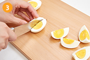 固ゆで卵の殻をむき、縦4つにくし切りにする。