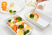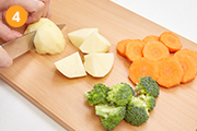 じゃがいもは一口大に、にんじんは7mm幅の輪切りにし、ブロッコリーは小房にわける。
