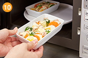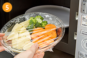 (4)を全て皿にのせたらラップをして、レンジで4分間加熱する。