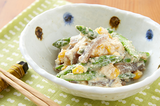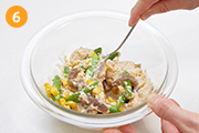 アスパラ・こんにゃく・コーン、(5)を全て加えて、和えたら完成。