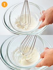 生クリームと砂糖を合わせて9分立て程度にしっかり泡立てる。
